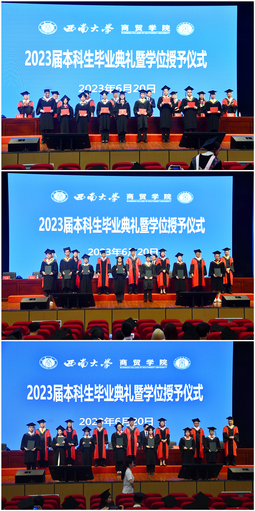 随后,主席台领导为毕业生代表颁发毕业证书。王志坚副校长及学院学术委员会委员为获得学士学位的毕业生授予学位证书,扶正流苏,并合影留念。