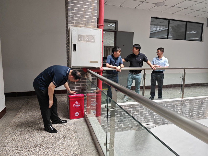 王熹和张应良以防火、防水、防漏电、防盗、防坠为检查重点,逐一对九教各楼层的安防设施进行检查,深入细致地排查每一个风险点,并询问工作人员是否熟知实验室的安全管理条例、应急处置规则以及消防器材的使用方法。同时,胡继宽、黄维兵向党政领导汇报了长期以来九教在安全管理中存在的重难点问题、需整改修缮内容、已申报待处理风险等。
