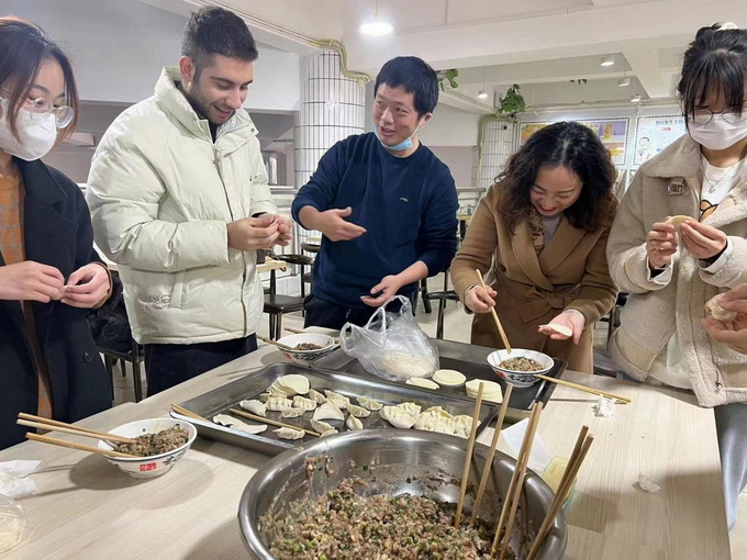 中午,同学们来到学校食堂一起包饺子,师生一边亲手制作,一边交流学习生活。活动现场时刻洋溢着欢乐,充满佳节的喜庆氛围。
