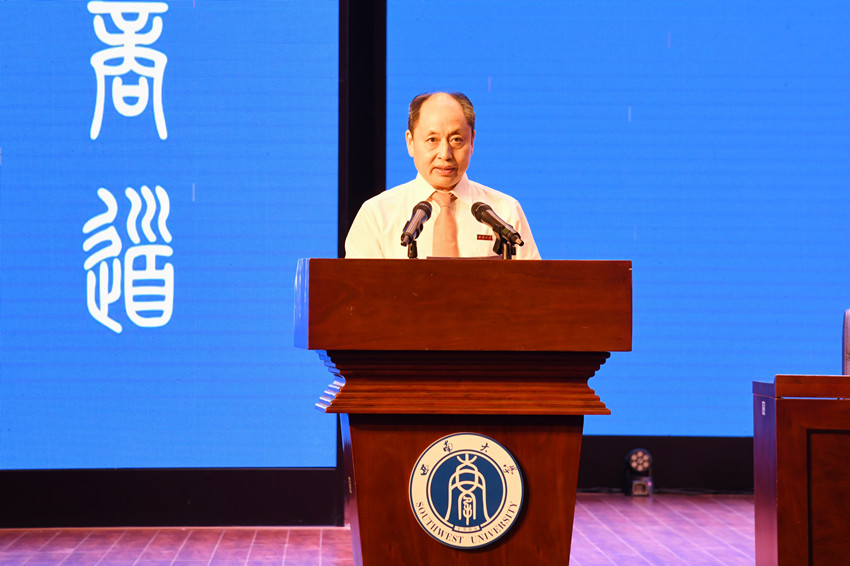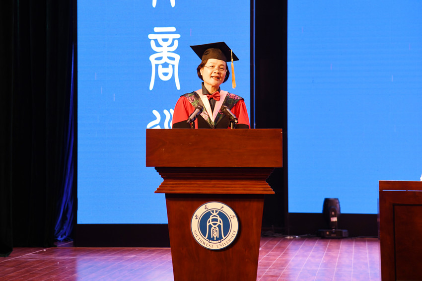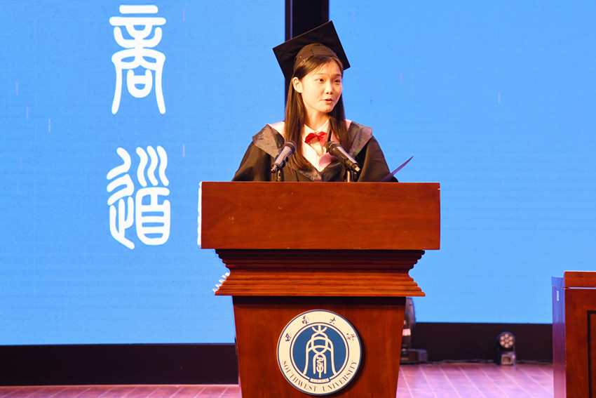 “亲爱的母院,您好!我们因毕业需请假离校,去往祖国各地,时间永远,归期暂定……”2022届本科毕业生代表唐诗为在仪式上深情发言,她满怀感激之情表达对学校、老师和同学的留恋和祝福,满怀憧憬之意倡议全体毕业生以青春之画笔,独家定制精彩之人生。
