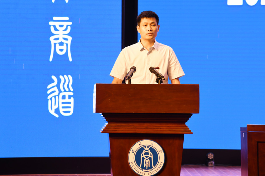管理科学与工程系施庆伟博士作为教师代表发言。他希望全体毕业生坚定理想,胸怀家国,坚定强国有我的志气;砥砺奋进,担当有为,树起民族复兴的骨气;学无止境,上下求索,增强大有作为的底气!他祝愿全体毕业生作为与新时代同向同行共同前进的一代,成为胸怀壮志、勇担重任的时代新人。