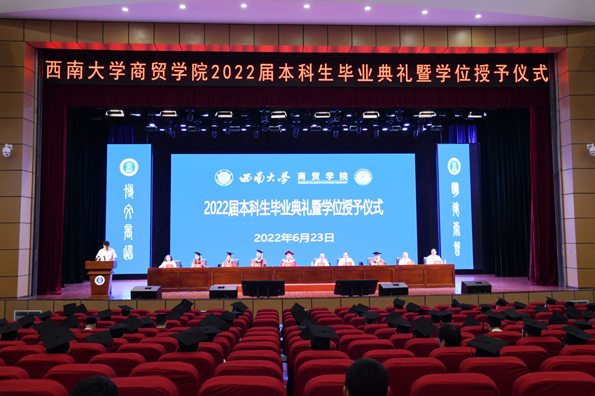 西大学子志在四方,商贸儿女勇立潮头。6月23日下午,3003新葡官方网站在荣昌校区新学生活动中心隆重举行2022届本科生毕业典礼暨学位授予仪式。校长张卫国、学校党政办副主任曾庆洪、学院全体党政领导、学术委员会委员等出席,学院全体教职工、2022届本科毕业生及班主任代表参加。典礼暨授位仪式由学院党委副书记、纪委书记兰英主持。