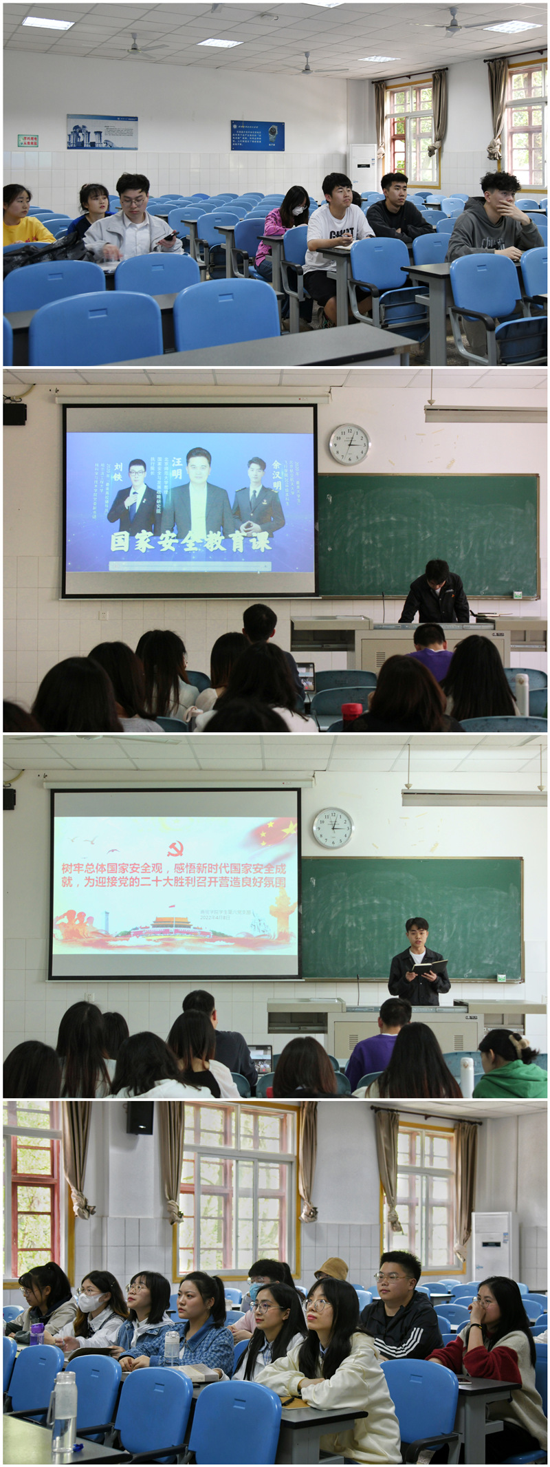 各学生党支部在党员同志孔祥暄、陈燕、罗振、董娅妮、王婉洁、杨贤、张馨颖的组织下有序开展活动。学生党员们通过观看视频、学习《中华人民共和国国家安全法》,深入学习总体国家安全观,系统掌握总体国家安全观的内涵和精神实质,树立国家安全底线思维,将国家安全意识转化为自觉行动,强化责任担当。
