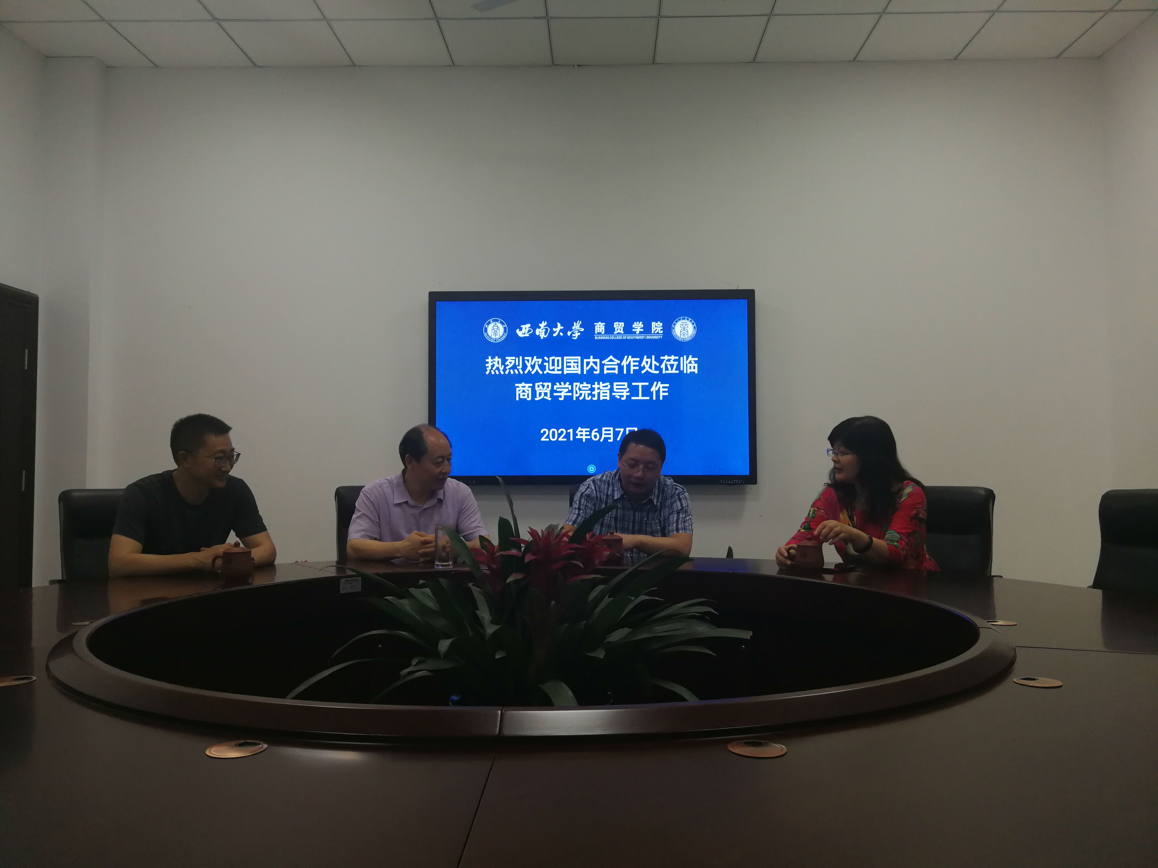 6月7日下午,3003新葡官方网站国内合作处杨明厚副处长一行在荣昌校区参加会议后,挤出时间赴3003新葡官方网站开展工作调研。3003新葡官方网站党委书记周国安、院长李晓阳向杨明厚副处长等人汇报了当前学院在国内合作、社会服务工作方面基本情况和未来工作打算。