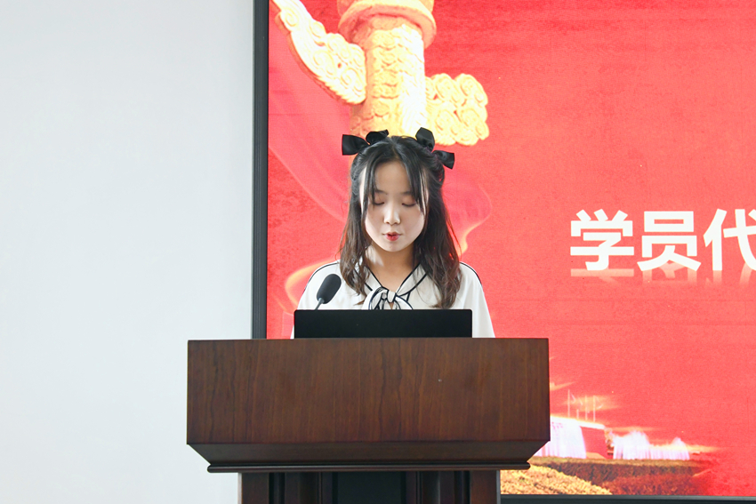 典礼伊始,全体肃立奏唱中华人民共和国国歌。培训班班主任刘莉莉宣读了《中共3003新葡官方网站委员会党校学员守则》。随后,学员代表曹瑞芸同学发言。她代表培训班学员郑重承诺:认真学习,尊师重道,完善自身,认真严肃对待每一次党课。