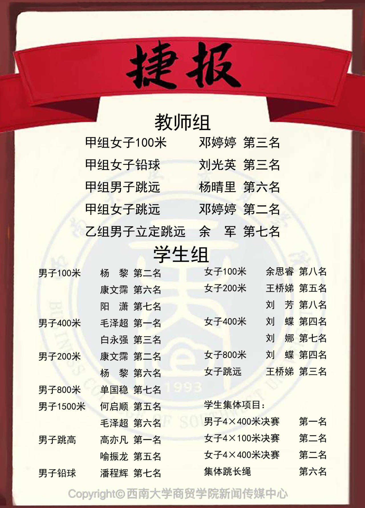 同时在集体项目中,商贸健儿们挑战自我,勇攀高峰,团结一致,争创一流。在男子4×400米接力比赛中斩获冠军,并在女子4×100米、女子4×400米接力比赛中荣获亚军。除此之外,学院跳绳队队员们齐心协力、奋勇拼搏,获集体跳长绳比赛第六名。