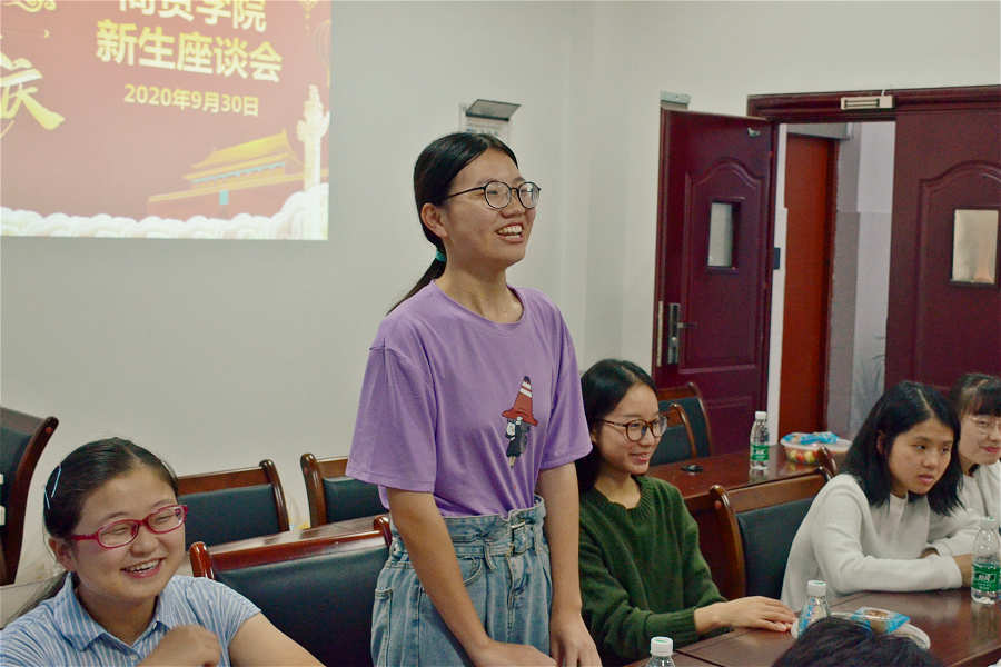 在会上,物流管理类刘玉婷、信息管理与信息系统专业蒲美琴、市场营销类贾宝成等来自不同省份、不同专业的新生代表纷纷与大家分享了入学以来的见闻和感想,畅谈在大学校园的收获和自己的大学规划。