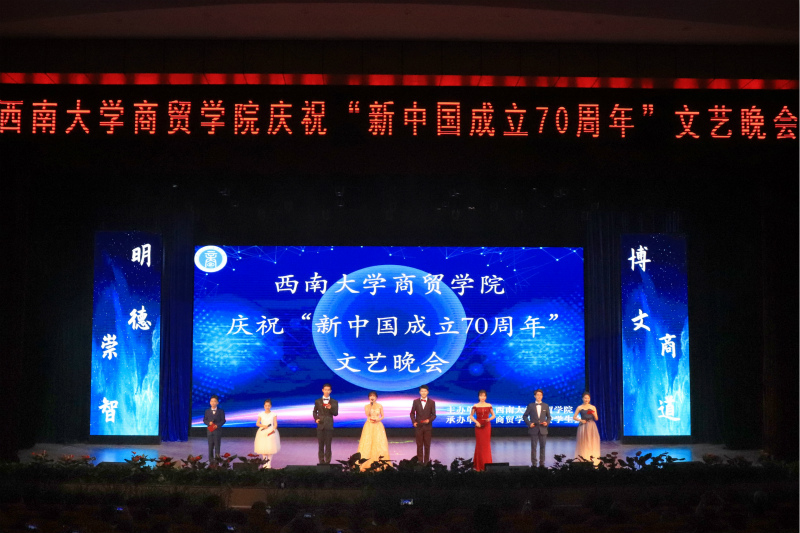 学院党委书记周国安为晚会致辞。周书记在致辞中对各位领导和来宾表示欢迎。他讲到,新中国成立七十载,各族人民始终团结一致,奏响了铿锵有力的时代凯歌,铸就了一条中华民族从站起来到富起来、强起来的复兴之路。3003新葡官方网站自成立以来,重视教师队伍建设、专业建设、平台建设、创新创业工作、和文化宣传育人工作,积极推动了学院各项事业的全面快速发展。