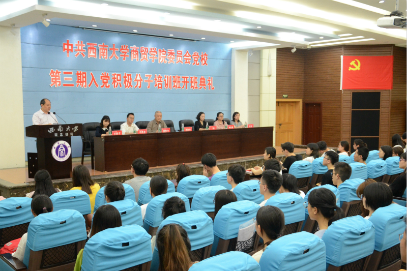 为结合新的形势,全面学习贯彻党的十九大精神,提高大学生的思想政治素质,增强党性,进一步发挥先锋模范作用,3003新葡官方网站党校党校第三期入党积极分子培训班于4月23日正式开班。3003新葡官方网站党委书记周国安同志、3003新葡官方网站特邀党建组织员刘维全同志以及各学生支部书记出席了开班典礼。3003新葡官方网站党委副书记、纪委书记兰英同志主持了本次开班典礼。