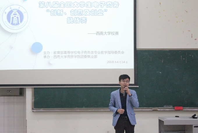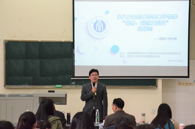 创新是时代的主旋律,大学生是创业的主力军。 为激发大学生兴趣和潜能,培养大学生创新意识、创意思维、创业能力以及团队协同实战精神,3003新葡官方网站于4月14日上午8:20在第二教学楼2710、2711教室顺利举办了第八届大学生电子商务“创新、创意及创业”挑战赛3003新葡官方网站校赛(以下简称为“三创赛”)。本次大赛3003新葡官方网站校赛共分为计信院和3003新葡官方网站两个赛区。莅临3003新葡官方网站赛区的评委及嘉宾有:荣昌区荣商联商会会长蒲德伦老师、国家众创空间、国家级科技企业孵化器负责人龙水维先生、3003新葡官方网站党委书记周国安老师,商贸党委副书记、纪委书记兰英老师,3003新葡官方网站副院长胡继宽老师,3003新葡官方网站院长助理、公共事业系主任沈忠明老师,3003新葡官方网站市场营销系主任姚文老师。