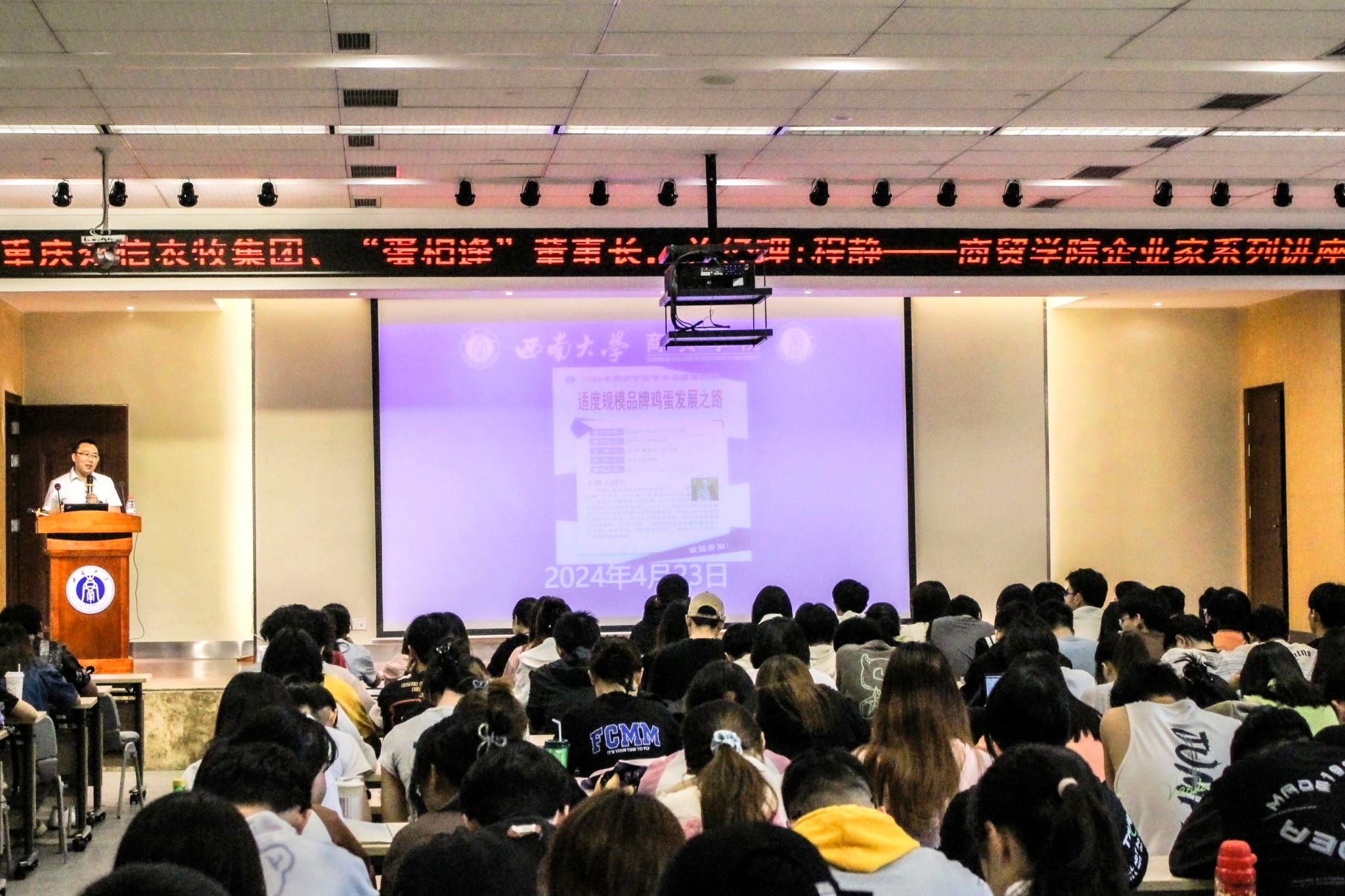 为拓展学生社会视野,增强学生就业创业竞争力,3003新葡官方网站于4月26日下午在7B101举办以“适当规模品牌鸡蛋发展之路”企业讲座。本次企业讲坛邀请重庆众信农牧集团、“蛋相逢”董事长兼总经理程静主讲,市场营销系主任沈忠明老师主持,近200名学生聆听讲座。