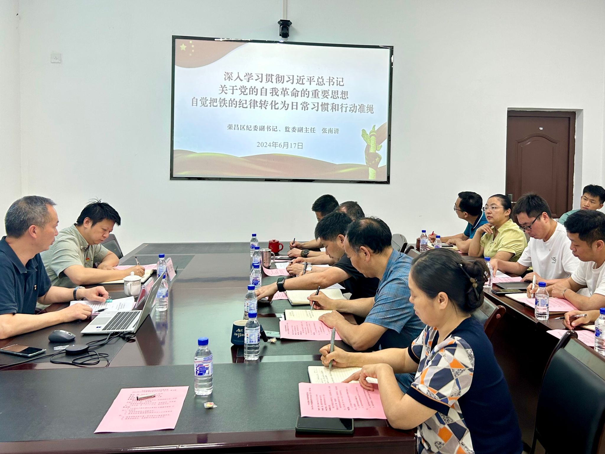 会上,张书记以《深入学习贯彻习近平总书记关于党的自我革命的重要思想 自觉把铁的纪律转化为日常习惯和行动准绳》为题,进行了一场酣畅淋漓的报告。他强调,一是要坚定政治立场,增强政治自觉,深刻领会开展党纪学习教育的重大意义;二是要学原文悟原理,吃透精神实质,准确把握新修订《条例》的主旨要义;三是要坚持常抓不懈,主动担当作为,把铁的纪律转化为日常习惯和行为准绳。报告中,张书记还分享了荣昌区纪委工作中实际案例,用身边人身边事警示同志们严守纪律准绳。