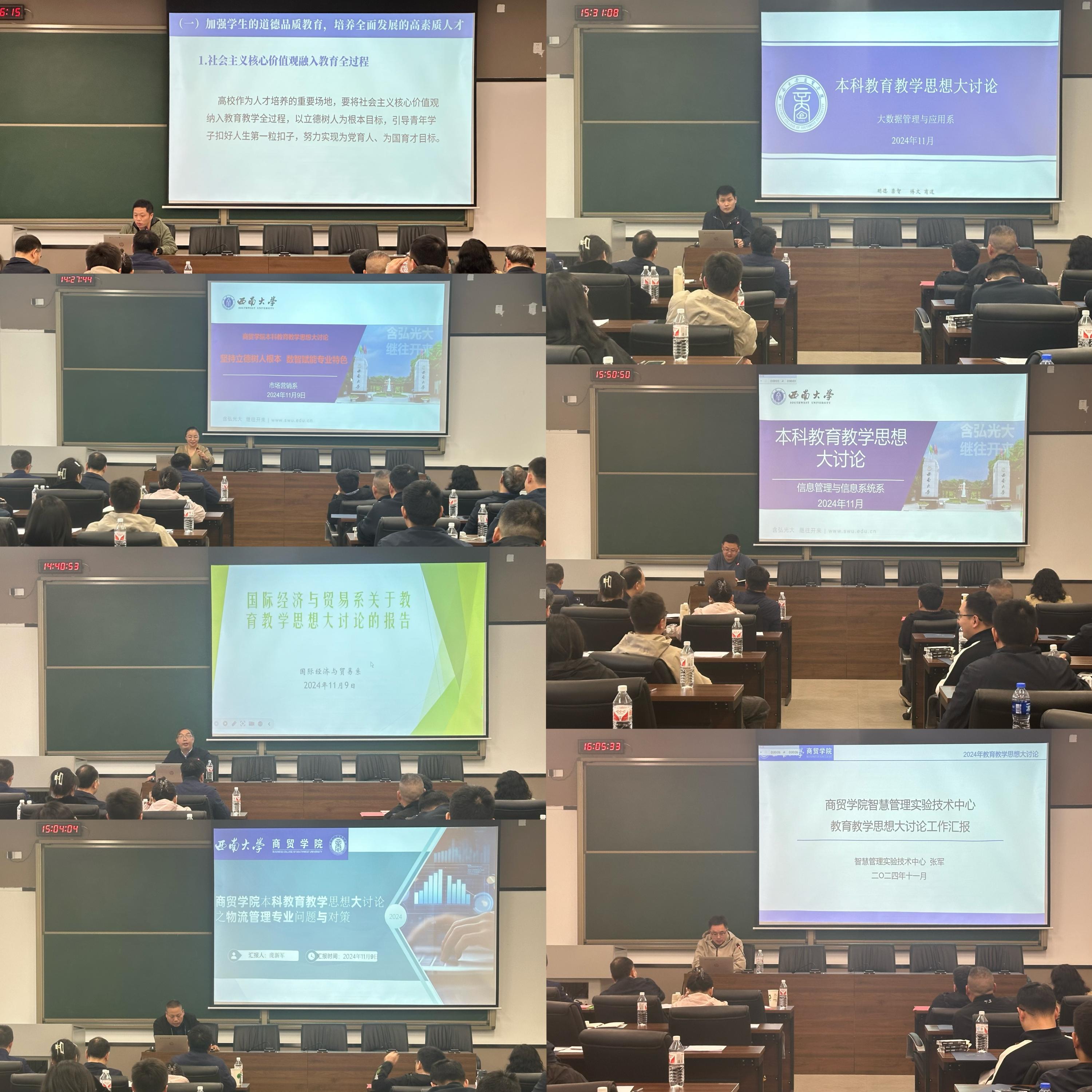 讨论交流中,根据前期各部门分工安排,各负责人进行工作汇报。学工办团委书记廖鹏以“立德树人 启智润心 融合创新 育商英才”为题,阐述了加强学生道德品质能力建构的举措建议;教务办公室主任、市场营销系教师刘光英以“坚持立德树人根本 数智赋能专业特色”为主旨,介绍了市场营销系内大讨论活动的开展情况,讨论的主题、形成的共识、一流专业建设的举措等;国际经济与贸易系主任姚文结合问卷调研结果,总结了树立良好学风、提升教育教学质量的建议与举措;物流管理系主任庞新军介绍了企业调研、学生调研的结果,聚焦物流管理专业调整与优化升级,提出了一系列的思路方案;大数据管理与应用系主任施庆伟汇报了系内讨论的结果,总结介绍了“以技术为主导”的专业发展设想;信息管理与信息系统系主任助理温亮明结合信管专业发展现状,总结了找准定位、明确优势、主动转型、彰显特色的专业建设思想;智慧管理实验技术中心主任张军结合实验室建设现状,指出实验室中心将会不断提升实验教学质量,以更好地服务师生,为学院“高级智慧管理人才”培养目标提供支撑。