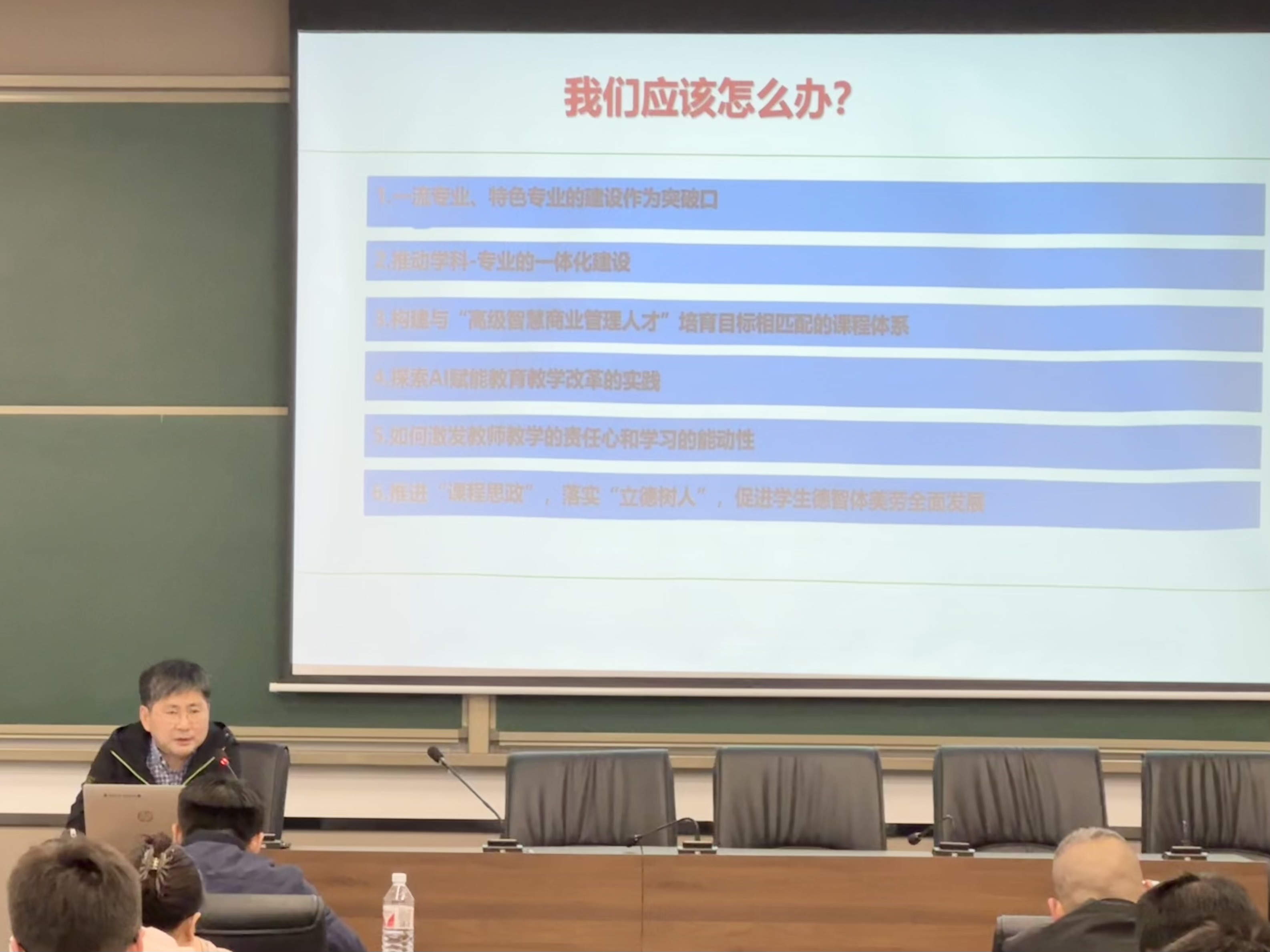 学院院长张应良从本科教育教学、学院队伍建设、学院科研成果方面作汇报。张院长表示,要结合未来高等教育变革的方向,以塑造高等教育未来的原则指导学院办学,加快学院教育数字化转型,推动学院教育教学高质量发展。张院长强调,要强化专业建设,以一流专业、特色专业的建设作为突破口,推动学科、专业的一体化建设;要推动教学改革,构建与“高级智慧商业管理人才”培育目标相匹配的课程体系,探索AI赋能教育教学改革的实践;要发挥课堂主阵地,推进“课程思政”,落实“立德树人”,促进学生德智体美劳全面发展。