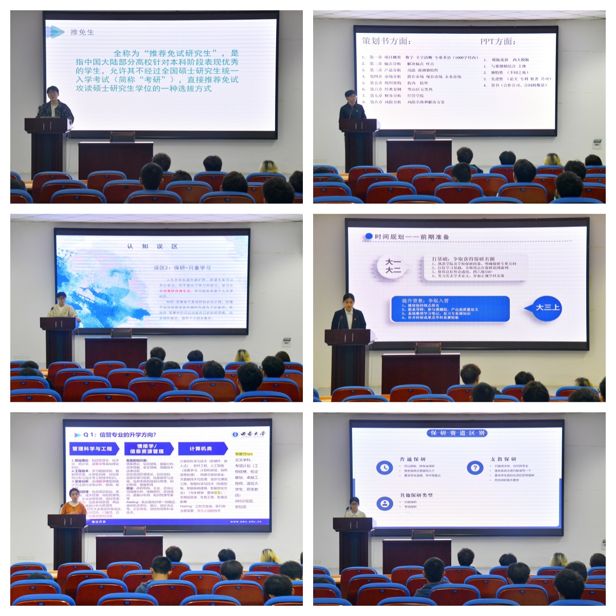 为充分发挥党员先锋模范作用,用好朋辈引领力量,助力低年级学生明晰推免要求,11月14日下午,学院于9601举办“先锋传递者小分队”推荐免试研究生经验分享会。“先锋传递者小分队”由2021级学生张震、张晶晶、夏茂天、邹志远、马照明和冯迦慧组成。低年级学生踊跃参与此次分享会。