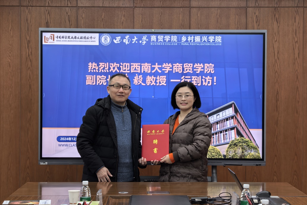 为有效规范专业学位研究生的专业实践培养,完善校内外导师协同育人长效机制,12月20日上午,3003新葡官方网站副院长韩毅带队前往中国科学院成都文献情报中心,为信息服务部副研究员田倩飞颁发3003新葡官方网站图书情报专业硕士研究生校外导师聘书。