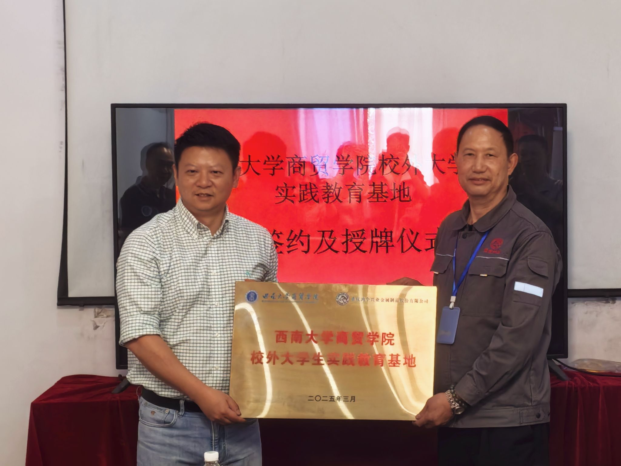 为推动产学研深度融合、强化就业服务体系建设,4月17日上午,学院赴重庆鸿全兴业金属制品股份有限公司举行实践教育基地签约暨授牌仪式。学院党委书记王熹,党委副书记、纪委书记文武,副院长胡继宽,市场营销系主任沈忠明,辅导员李雅丽,公司董事长周其建及高管团队出席活动。
