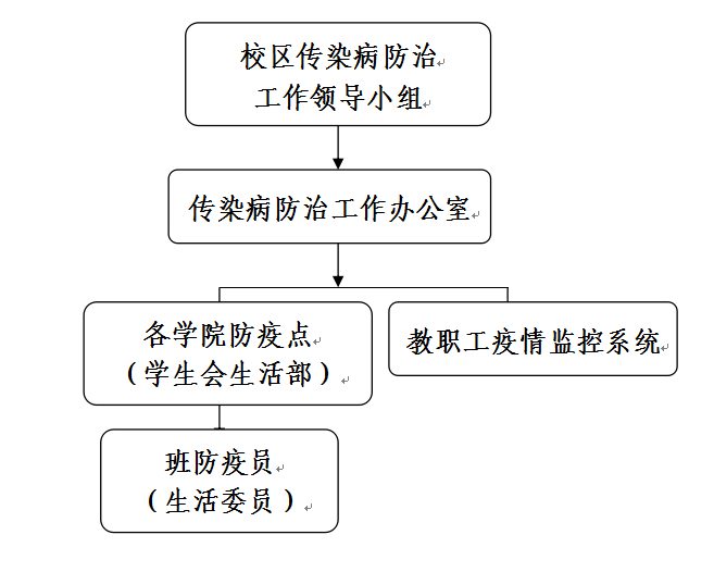 三、为加强疫情监测和预防,按照上级有关文件精神,根据群防群治原则,建立校区卫生防疫网络(附件1):每个学生班设防疫员1人(各班生活委员),各学院建立防疫点(挂靠学生会生活部);防疫员负责向同学宣传防疫知识,发现并及时向所在学院、校区卫生科或学工办报告疫情。