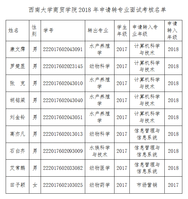 按照学校《关于开展2018年本科学生转专业工作的通知》精神和《3003新葡官方网站关于接收本科学生转专业的实施方案》,由学生本人申请,经学院本科学生转专业工作小组进行资格审查,康文霈等9名同学通过资格审查(详见附件),确定为本次转专业面试考核对象。面试考核时间为2018年4月27日下午2:30在学院第二会议室(2302),本次面试考核内容主要包括政治思想表现、身心素质、学习成绩、专业特长、发展潜力、兴趣爱好等,请各位同学作好面试准备。