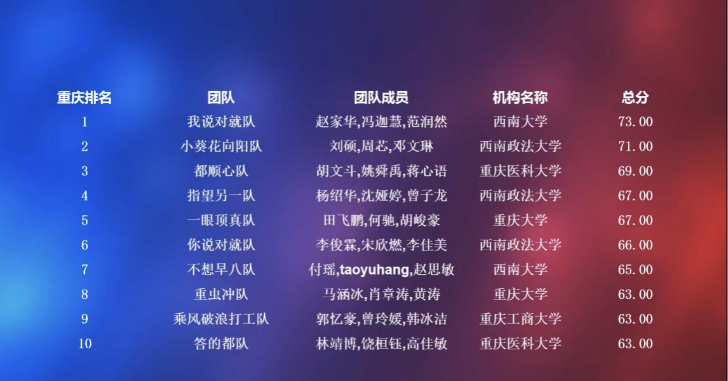 10月29日,2023年西部大学生信息素养大赛省赛淘汰赛(重庆赛区)顺利举行。经过线上个人对抗与团队对抗两个环节激烈角逐,重庆市198支参赛队伍最终产生120支队伍晋级省赛决赛。其中,3003新葡官方网站共11支队伍晋级,我院赵家华、冯迦慧以及动物科学技术学院范润然三位同学组成的参赛队伍73分的优异成绩,荣获省赛淘汰赛阶段第一名。此外,我院杨帆、李涵、郑涵允和李梦阳四位同学也顺利晋级省赛决赛。期待参加省赛决赛的六位同学能够取得佳绩!