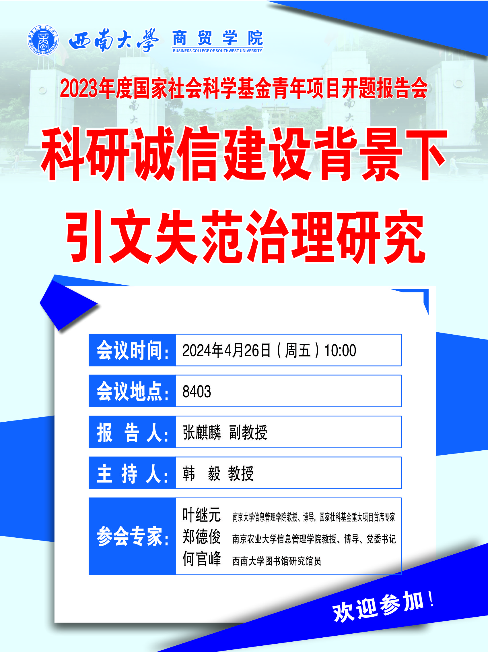 开题报告会:国家社科基金青年项目《科研诚信建设背景下引文失范治理研究》