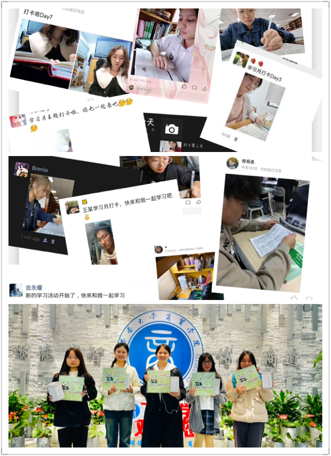 活动期间2023级倡议全体同学开展每日学习打卡分享学习状态和心得。同学们踊跃参与纷纷在图书馆自习室和宿舍都留下了认真学习的身影。