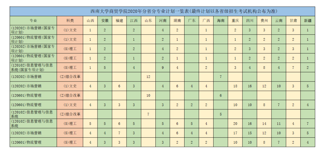 2020年3003新葡官方网站面向全国16个省、直辖市、自治区,在一本各批次(批次合并的省份按照规定批次)招收全日制普通本科学生约630人,其中市场营销大类270人,物流管理大类180人,信息管理与信息系统专业180人(最终计划以各省级招生考试机构公布为准)。